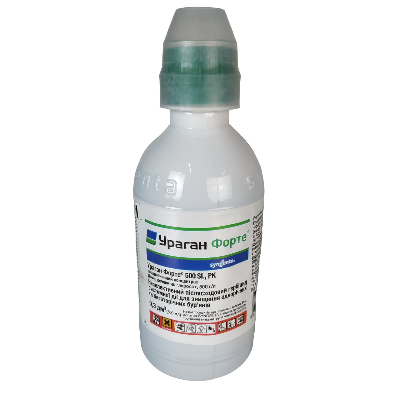 Несективний післясходовий гербіцид Ураган Форте, системного впливу, успішно знищує однорічні та багаторічні бур'яни. Препарат виготовлений за технологією HiTech. Засіб містить у складі активну речовину гліфосат, завдяки якому засіб, потрапляючи на бур'яни, швидко всмоктується й проникає через листя до кореневої системи, водночас загибель бур'янів настає вже через 3-5 днів після оброблення.